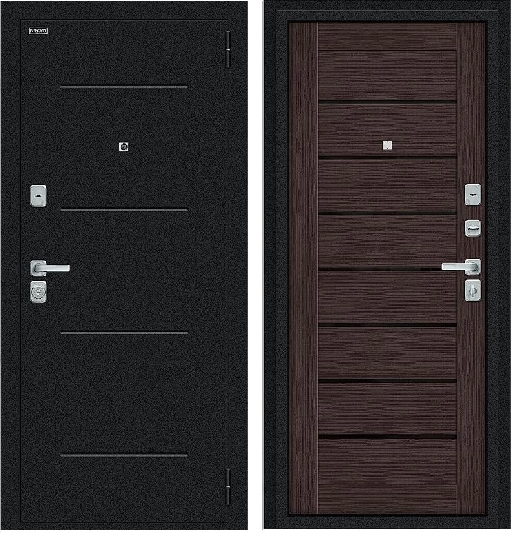 Надежная входная Дверь Браво Техно/BChrome Букле черное/Wenge Melinga премиум класса по цене 33 183 руб. Большая толщина стали защитит от проникновения в ваш дом, квартиру или коттедж. Используется очень качественная фурнитура: замки, цилиндры, ручки, защелки. Покрытие и отделка двери изготовлено под внимательным контролем производителя. Дверь имеет долгий срок службы и гарантию.